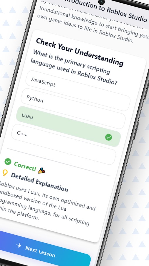 Скачайте сейчас и начните свой путь в программировании в Roblox Studio! Заложите прочный фундамент в написании скриптов на Luau с помощью нашего проверенного образовательного подхода. Независимо от того, новичок ли вы в программировании или хотите расширить свои навыки, это приложение предлагает вам необходимую структурированную программу обучения.