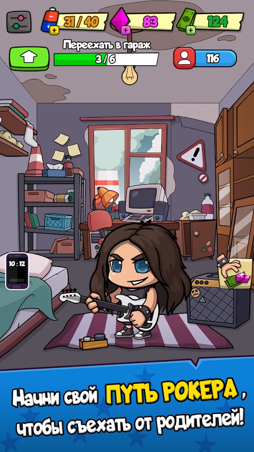 Создай свою рок группу как симулятор игры на гитаре. Твоя карьера музыканта в твоих руках — прокачивай персонажа как в Idle music играх. Группа и банда ждет тебя чтобы вместе выступать на рок аренах. Твой гараж или хижина музыканта требует апгрейда, чтобы выступать на лучших метал сценах. Панк музыкант это тоже симулятор бомжа только с гитарой, каждый панк мечтает стать звездой. Декорируй свою комнату, выполняй различные квесты, кликай на ноты и слушай метал музыку. Жизнь гитариста — это драйв рок и музыка как guitar hero. У тебя будут подписчики, копи их они принесут тебе деньги, это твои преданные фанаты.