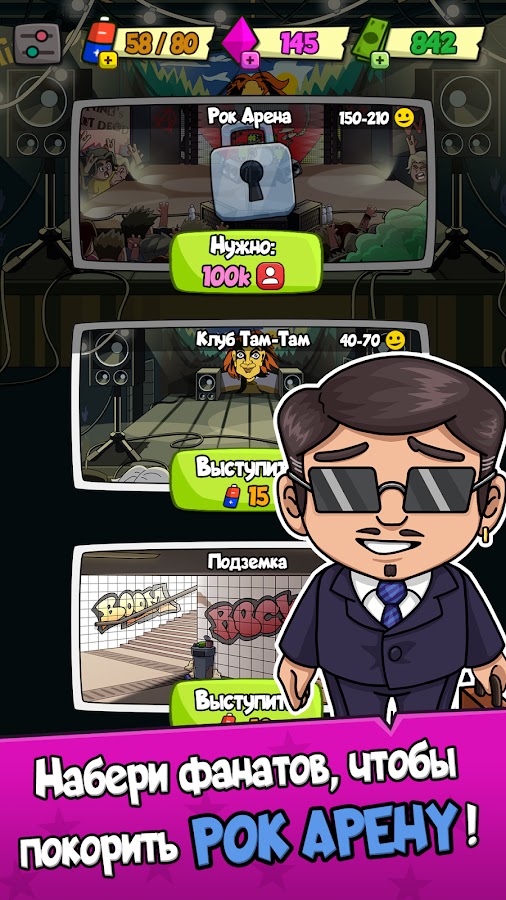 — Различные локации — пой в подземном переходе, на улице, или в клубе, но доберись до рок арены
