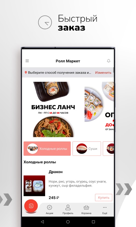 Качество ресторанной еды по ценам обычного магазина! Мобильное приложение «РОЛЛ МАРКЕТ» – Твой Ресторан в Твоем кармане! Скачай приложение – будь в курсе наших скидок и акций!