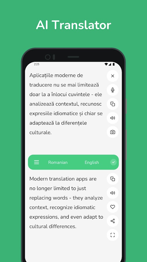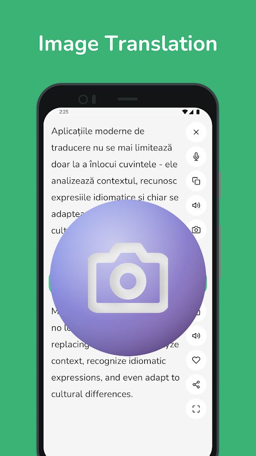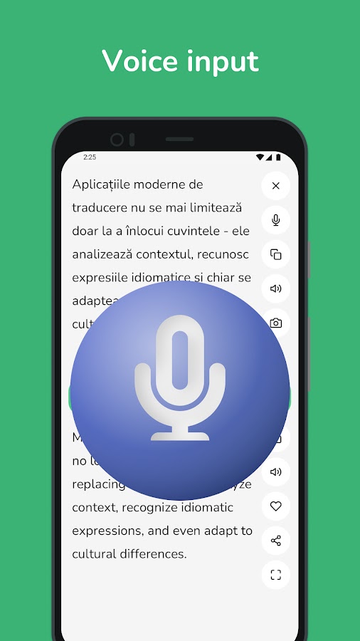 • Распознавание голоса: говорите прямо в приложении, и наш искусственный интеллект мгновенно переведет вашу речь, делая разговор более плавным.