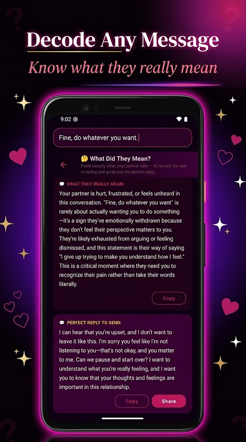 Вставьте то, что сказал ваш партнер, и наш ИИ раскроет истинный смысл — а также предложит вам идеальный ответ.