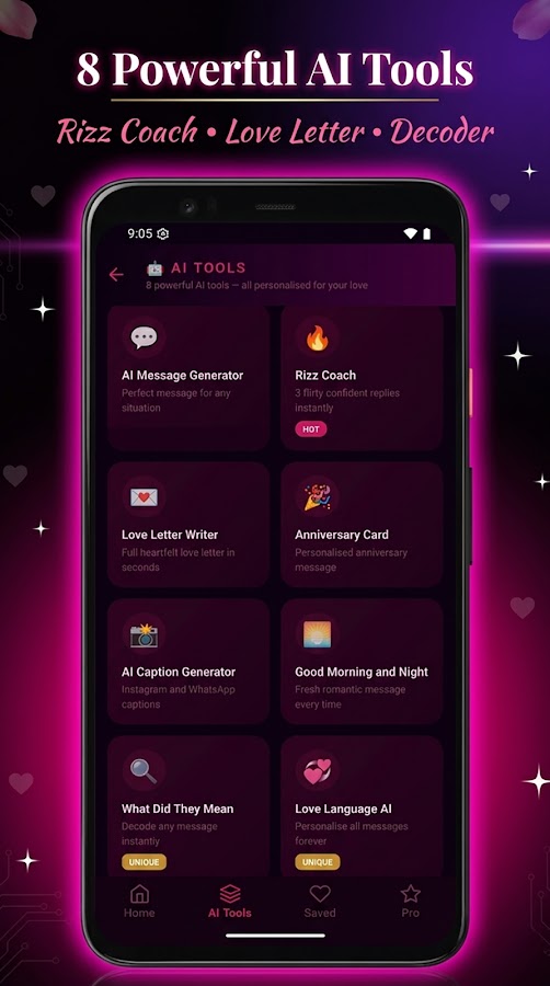 Единственное приложение для любви, где ИИ пишет свежие романтические сообщения — персонализированные, уникальные, никогда не повторяющиеся.