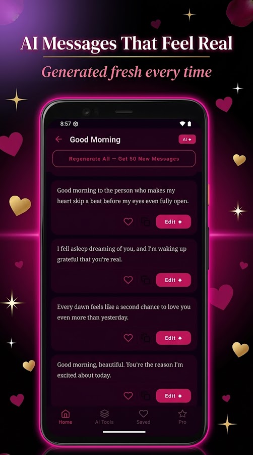 В отличие от приложений со статичными сообщениями, Romantic AI генерирует 50 совершенно новых сообщений каждый раз. Каждое сообщение кажется свежим. Каждое слово кажется личным.