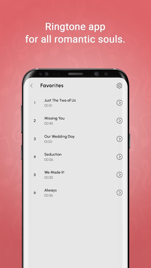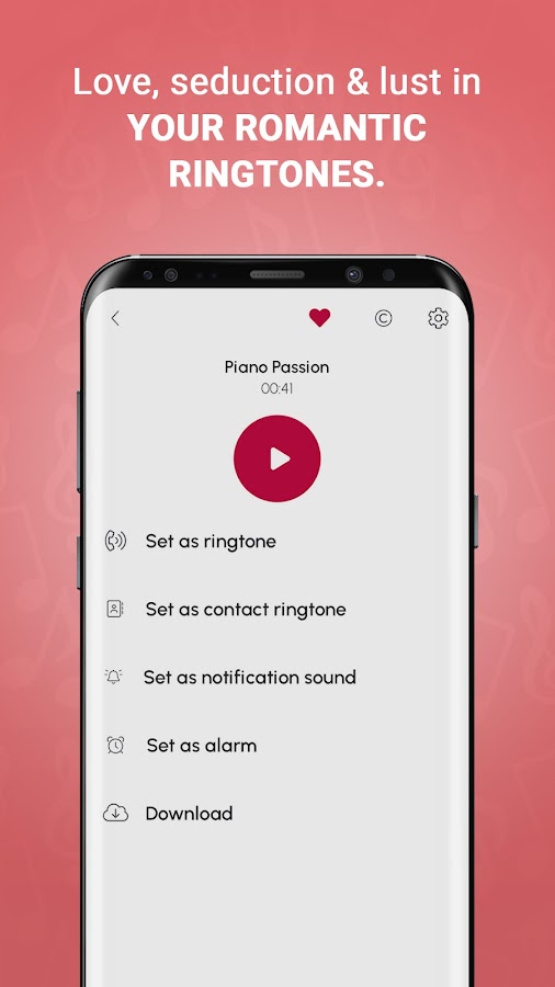 Лёгкое в использовании и бесплатное для скачивания, Романтические Рингтоны на Звонок — это приложение с рингтонами о мелодия любви для всех возрастов. Когда бы тебе не понадобились бесплатные рингтоны на телефон и бесплатные обои на телефон в романтическом стиле, ты всегда сможешь найти их в этом приложении! Будь то романтическая музыка для того, чтобы выразить свои самые потаённые чувства, или же ты просто романтическая душа, это приложение поможет тебе подобрать романтическая музыка на телефон на твой вкус. Выбери подходящие тебе бесплатные рингтоны на телефон и бесплатные обои на телефон и поделись ими с теми, кто заставляет тебя испытывать любовь и ощущать романтику в воздухе. Ведь романтическая музыка всегда будет в моде.