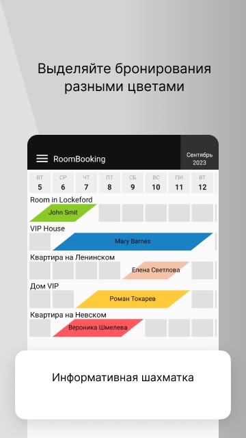 Наглядная шахматка покажет загруженность объектов и поможет быстро создать бронирование — выберите дату и объект прямо на телефоне.