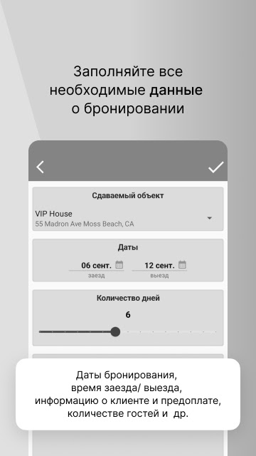 Приложение поддерживает многопользовательский режим — делите доступ между администратором и сотрудниками с ограниченными правами. Все участники команды получат уведомление о новых бронированиях или сдаче объектов.