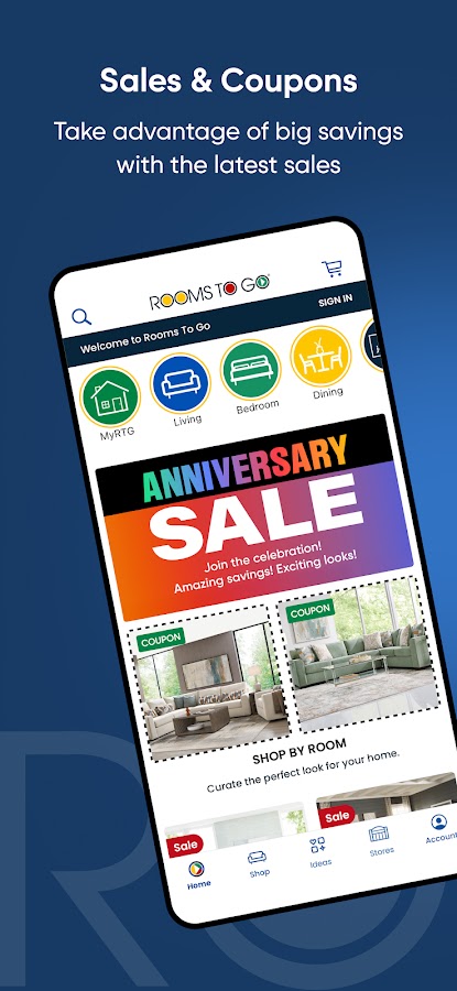 Следите за лучшей экономией, которую мы можем предложить, с помощью обновленных купонов в приложении. Участвуйте в лотереях и получите шанс выиграть подарочную карту Rooms To Go. Каждый раз, когда появляется промо-акция, вы будете одними из первых, кто узнает об этом.