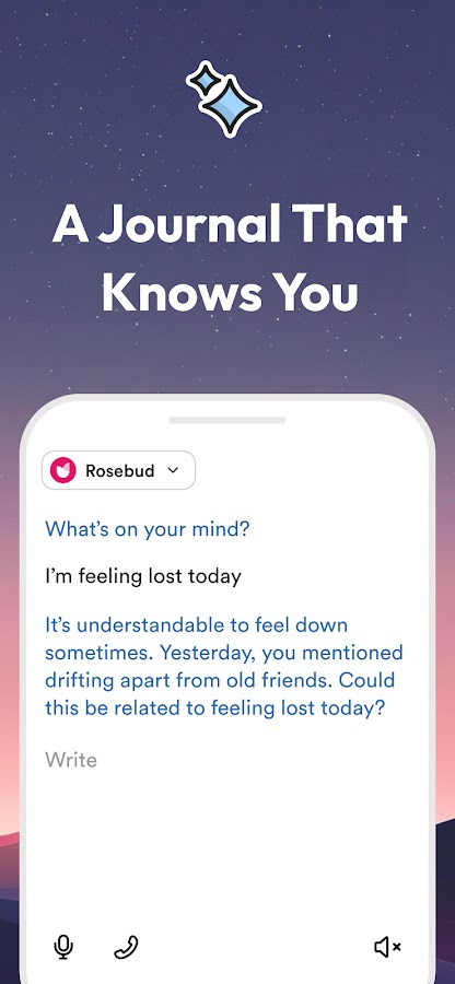 Rosebud — ваш персональный помощник по уходу за собой, управляемый искусственным интеллектом. Rosebud — это рекомендованный терапевтами инструмент для ведения дневника и саморефлексии, разработанный для поддержки вашего личностного роста и эмоционального благополучия. Rosebud — это дневник, который развивается вместе с вами, учится на ваших записях и предоставляет персонализированные подсказки, обратную связь и идеи, адаптированные для вашего развития.