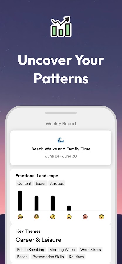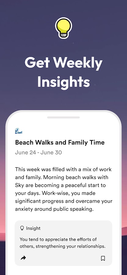 • Еженедельные аналитические материалы о личностном росте: отслеживайте темы, прогресс, победы, эмоциональный фон и многое другое с помощью комплексного еженедельного анализа, предоставляемого искусственным интеллектом.