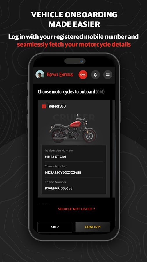 Просто войдите в систему, используя зарегистрированный номер мобильного телефона, чтобы автоматически получить информацию о вашем мотоцикле, и получите мгновенный доступ к множеству функций, включая планирование обслуживания, помощь на дороге и многое другое!
