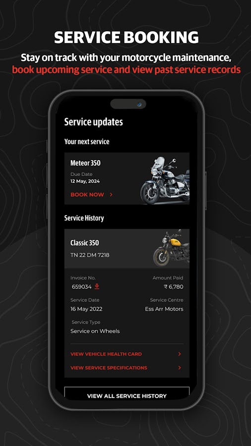 Будьте в курсе технического обслуживания мотоцикла, планируя его обслуживание и записывайтесь на предстоящие встречи. Просматривайте записи о прошлых обслуживаниях двухколёсного транспортного средства и историю обслуживания, смотрите видеоролики DiY и получайте напоминания о сервисах, чтобы ваш мотоцикл оставался в идеальном состоянии.