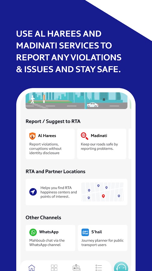 • Используйте службы Al Harees и Madinati, чтобы сообщать о любых нарушениях и проблемах и оставаться в безопасности. Будьте осторожны на дороге и сообщайте о любых нарушениях или проблемах.