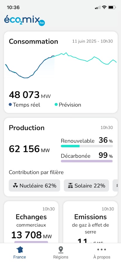 Приложение éCO₂mix, основанное на миллионах точек данных, собранных RTE, является инструментом прозрачности и образования, призванным помочь понять и наглядно представить цифры, информацию и тенденции развития электроэнергетической системы Франции.