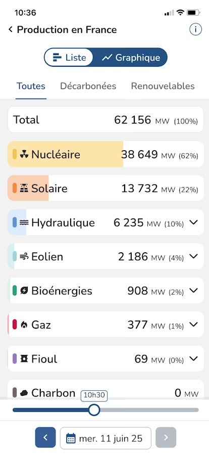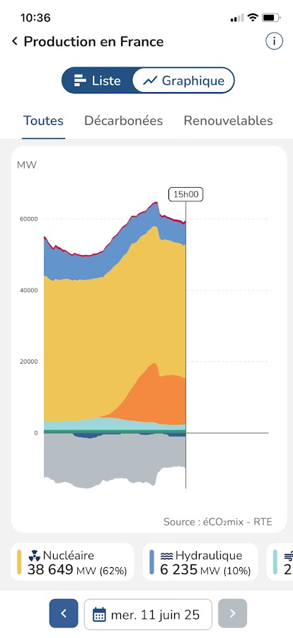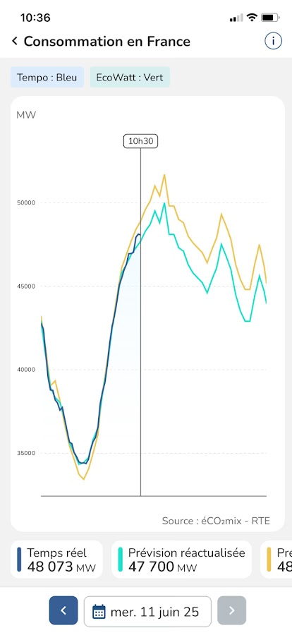 Благодаря éCO₂mix, бесплатному мобильному приложению, разработанному RTE, вы можете узнать данные об электроэнергетической системе, находящейся в постоянном движении: она следует ритму экономической активности и повседневной жизни и отражает пульс активности во Франции. Наблюдайте за колебаниями потребления электроэнергии: оно выше днем, чем ночью, выше в будние дни, чем в выходные, и выше зимой, чем летом.