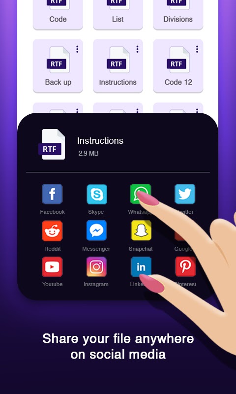 Пользователь в программе чтения документов может просматривать файлы, доступные для чтения, с помощью средства просмотра документов, которое также отображает файлы RTF и файлы Xls со страницами слов со слайдами. Средство просмотра файлов RTF перечисляет все файлы RTF в средстве просмотра файлов RTF через средство чтения файлов RTF для Android. В средстве просмотра файлов пользователь расширенных документов может легко просматривать все файлы RTF без каких-либо помех. Как пользователь программы чтения файлов RTF для Android, вы можете поделиться офисным файлом в формате RTF с точки зрения doc, docs, Docx или других документов в качестве офисного приложения для чтения страниц с расширенным форматированием файлового формата в программе просмотра RTF Программа чтения файлов RTF для Android .