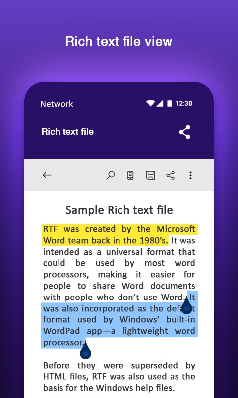 Легко просматривайте документ, имеющий формат RTF, в приложении для работы с документами, которое, как средство чтения документов, помогает пользователям читать файлы Word с расширенным форматированием или текстовые документы в программе чтения документов. Получите RTF-ридер для Android и начните читать, легко просматривая RTF-файлы на телефоне. Более усовершенствованная программа просмотра RTF также предлагает свои услуги на нескольких языках вместе с функцией обмена документами для удобства пользователя.