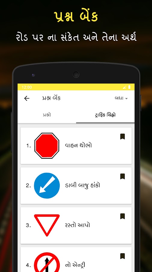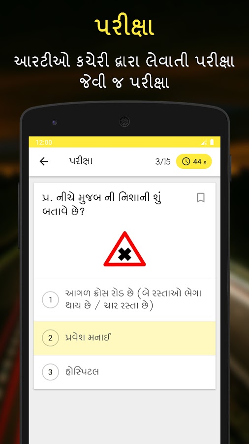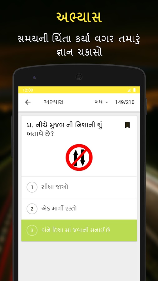 RTO Exam Gujarati — это приложение для практики сдачи экзамена на получение водительских прав, доступное на гуджарати (ગુજરાતી), хинди (हिन्दी) и английском языках. Вы участвуете в тесте на получение лицензии на обучение в RTO Гуджарате и готовы попрактиковаться перед настоящим тестом RTO? Не ищите ничего, кроме экзамена RTO в Гуджарате. Это приложение было специально создано для RTO Гуджарата и предлагает самую большую коллекцию вопросов и ответов для тестов на получение лицензии на обучение, дорожных знаков и их значения, а также другую полезную информацию на гуджарати (ગુજરાતી), хинди (हिन्दी) и английском языке.