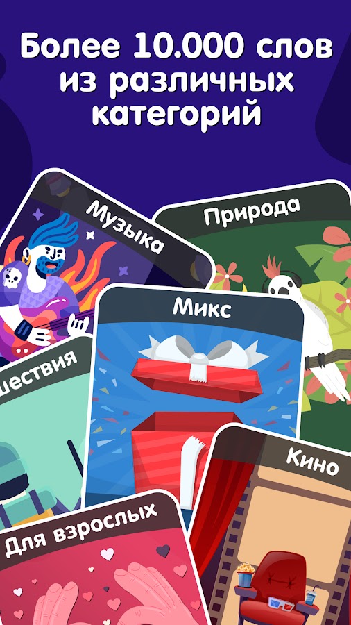 С огромным количеством слов из различных категорий, таких как «Фильмы», «Путешествия», «Для взрослых 18+» и многие другие шарады, вы никогда не останетесь без смешных моментов. Только убедитесь, что бабушка не подглядывает, когда вы играете в последнюю категорию!