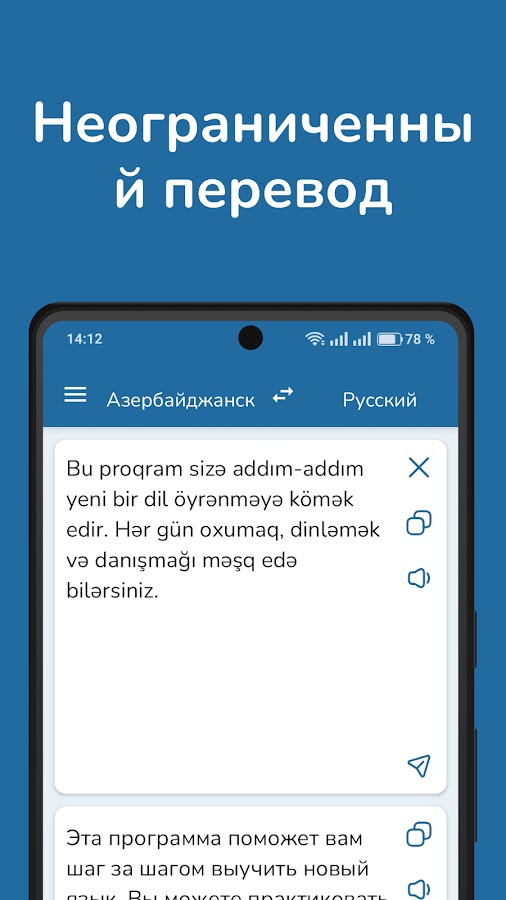 Независимо от того, изучаете ли вы азербайджанский или русский язык, путешествуете за границу или работаете за рубежом, это приложение-переводчик станет вашим незаменимым языковым инструментом.