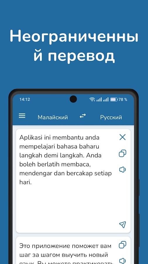 Загрузите сейчас и общайтесь свободно с одним из самых быстрых и надежных русско-малайских переводчиков на Android.