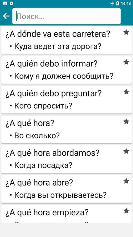 Быстрый русско-испанский офлайн-словарь, альтернативный перевод, часто используемые испанские предложения, тесты (письмо, аудирование, говорение) и игры…
