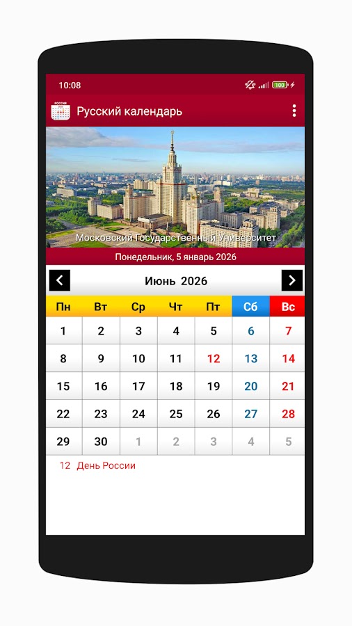 Это приложение «Русский календарь» представляет собой приложение-календарь, очень похожее на календарь на стене вашего дома, этот календарь очень полный и обновляется от национальных праздников до важных моментов, связанных с Россией, в этом календаре.