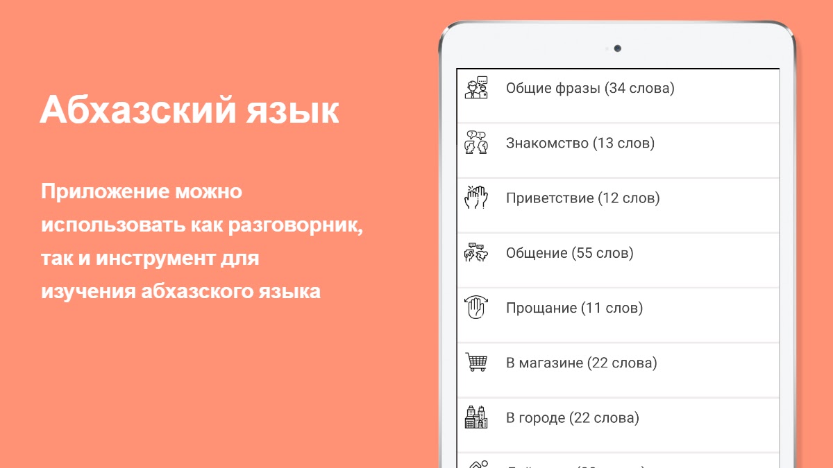 Русско-абхазский разговорник можно использовать соответственно, как разговорник, так и инструмент для изучения абхазского языка. Все абхазские слова написаны русскими буквами и разбиты на 8 логических тем, то есть разговорник рассчитан на русскоговорящего пользователя (туриста).