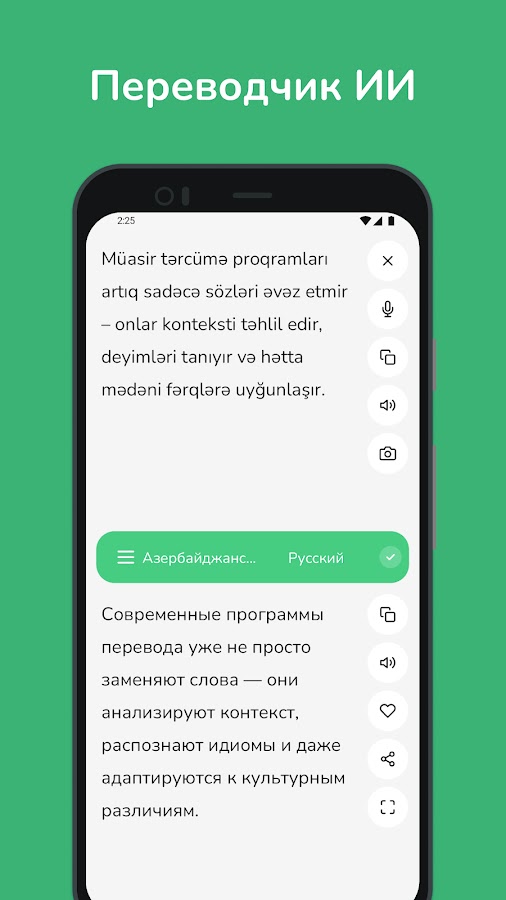 Раскройте силу языка с помощью нашего современного азербайджано-русского и русско-азербайджанского переводчика! Независимо от того, являетесь ли вы студентом, путешественником или профессионалом, этот переводчик на базе искусственного интеллекта создан для того, чтобы сделать общение простым и удобным.