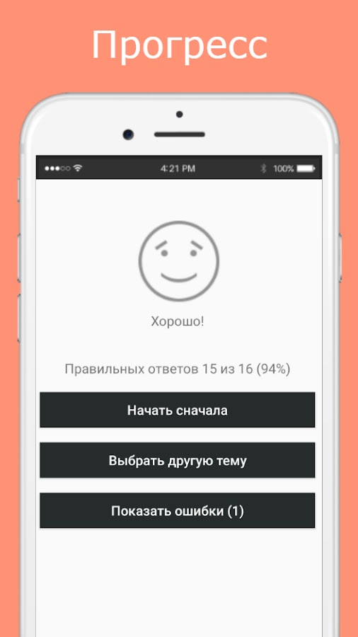 После прохождения теста по выбранной теме, можно просматривать ошибки. Также, результат прохождения теста по каждой из тем сохраняется, ваша цель — выучить все слова в выбранной теме на 100%.