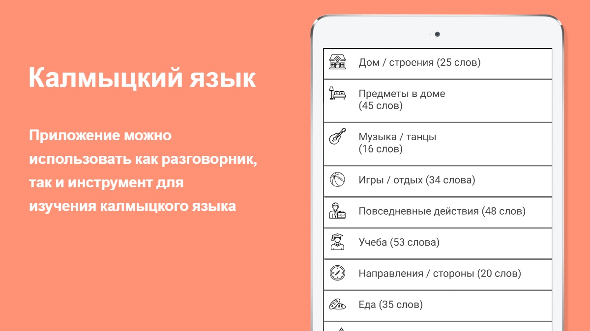Русско-калмыцкий разговорник можно использовать соответственно, как разговорник, так и инструмент для изучения калмыцкого языка. Все калмыцкие слова написаны русскими буквами и разбиты на 15 логических тем, то есть разговорник рассчитан на русскоговорящего пользователя (туриста).