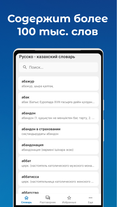 Есть функция поиск, чтобы быстро найти нужное вам слово сразу на двух языках. Вам не обязательно выбрать русско — казахский или казахско — русский. Введите слова в поиске и на русском языке и на казахском языке.