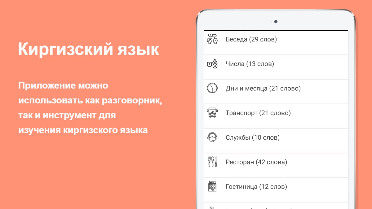 Русско-киргизский разговорник можно использовать как разговорник, так и инструмент для изучения киргизского языка (бесплатный самоучитель). Это профессиональная версия ранее вышедшего приложения, в котором также можно было изучать слова и фразы на киргизском языке.