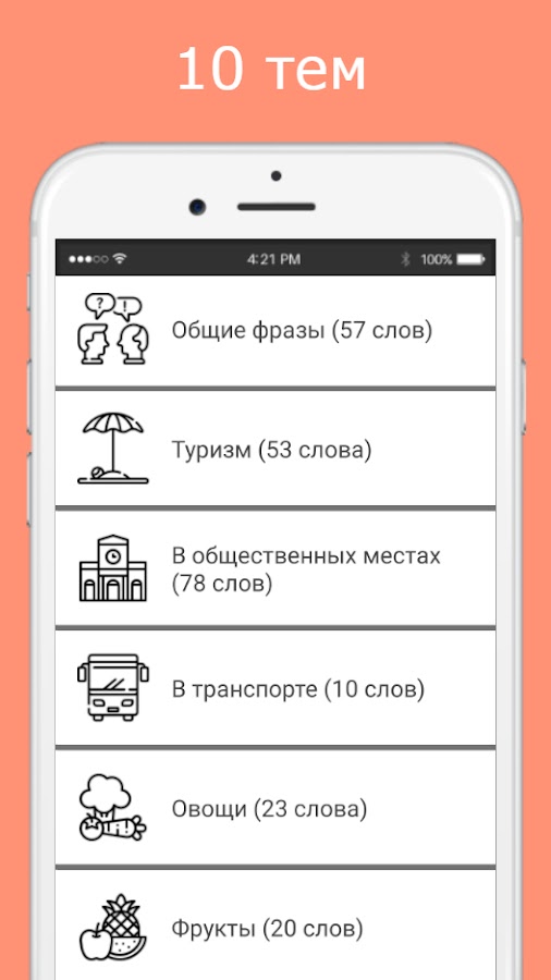 Приложение позволить Вам сделать первый шаг к изучению языка с нуля, заинтересовать вас, а дальше уже Вам решать — ограничиваться только разговорными фразами на русском языке, или идти дальше, изучая грамматику, лексику и синтаксис.