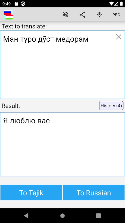 С помощью этого приложения вы можете быстро и легко переводить тексты, слова и фразы с русского на таджикский и с таджикского на русский язык.
