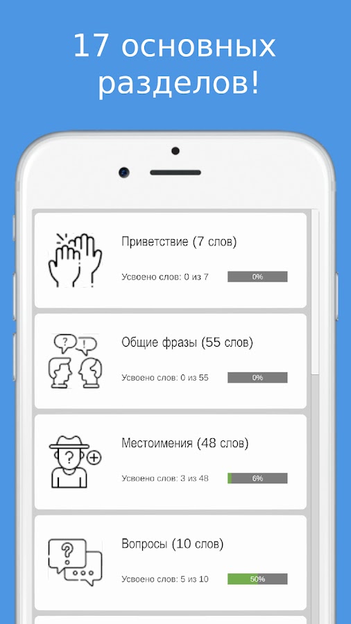 Приложение позволить Вам сделать первый шаг к изучению языка с нуля, заинтересовать вас, а дальше уже Вам решать — ограничиваться только разговорными фразами на русском языке, или идти дальше, изучая грамматику, лексику и синтаксис.