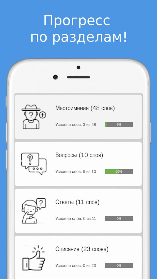Вообще, учить слова очень просто, по сути это некая игра, цель которой пройти каждый раздел на 100%!