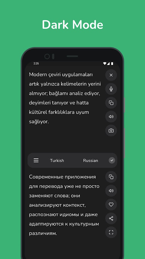 • Мгновенный перевод: получайте быстрые и точные переводы с турецкого на русский и наоборот, идеально подходящие для повседневного использования.