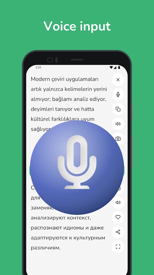 • Распознавание голоса: говорите прямо в приложении, и наш искусственный интеллект мгновенно переводит вашу речь, делая общение более плавным.