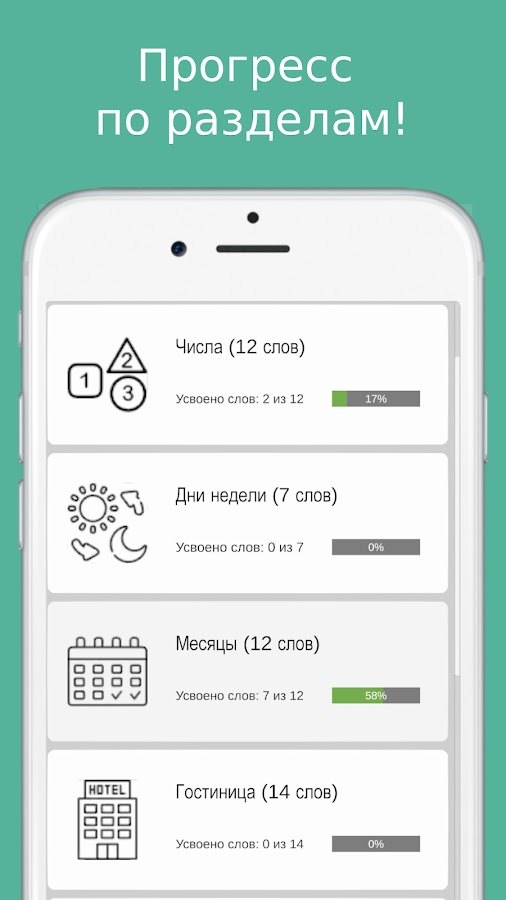 Вообще, учить слова очень просто, по сути это некая игра, цель которой пройти каждый раздел на 100%!