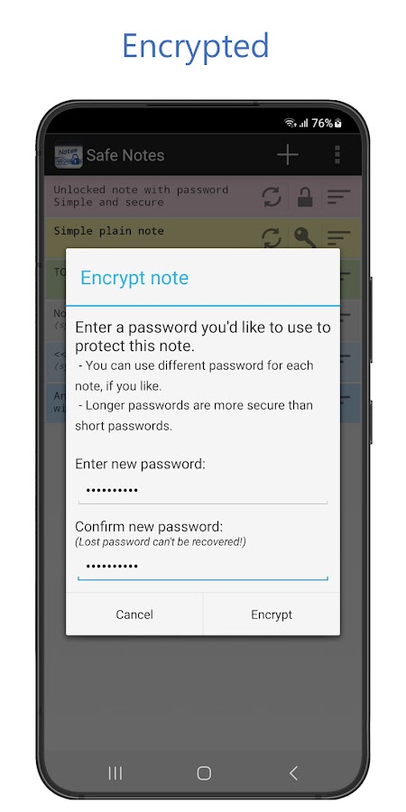 ★ Когда отдельная заметка заблокирована, пароль навсегда удаляется с вашего смартфона, и заметка не может быть расшифрована без вашего пароля. Вам не нужно доверять нам или любой другой третьей стороне, так как ваш пароль нигде не хранится.