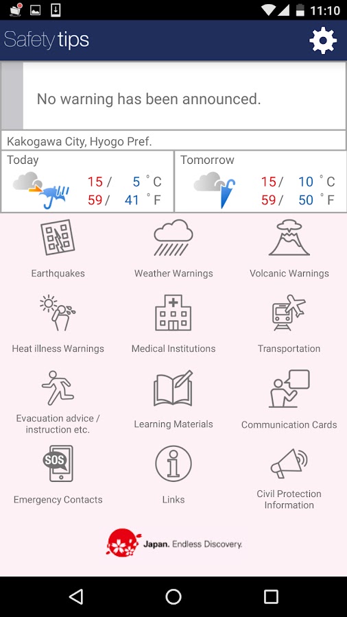 Это приложение уведомляет пользователя об EEW, предупреждениях о цунами, предупреждениях о вулканах, предупреждениях о погоде, предупреждениях о тепловых заболеваниях и информации о гражданской защите, выпущенной в Японии. Это бесплатное приложение, разработанное под руководством Японского агентства по туризму.