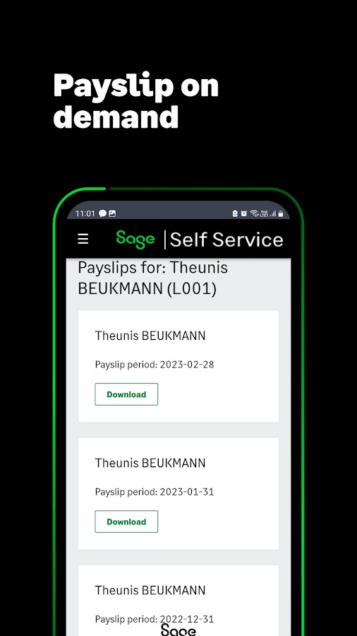 Sage HR & Payroll Mobility позволяет сотрудникам просматривать платежные ведомости и оставить остатки на своих смартфонах. Сотрудники, имеющие доступ к онлайновой системе самообслуживания также будут иметь возможность подать заявление на отпуск, подать претензии путешествия и обновлять личные / банковские реквизиты в зависимости от настроек безопасности, определенных Payroll офиса.
