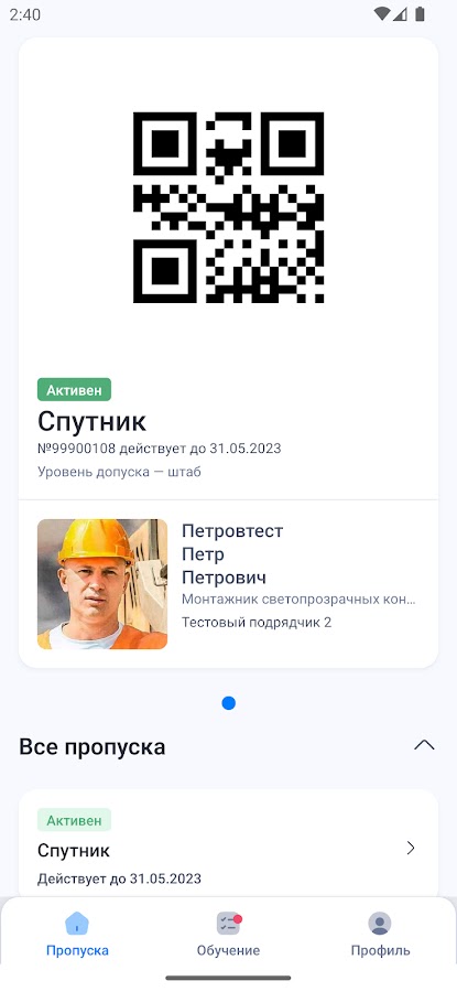 Мобильное приложение рабочего Группы Самолет. Предназначено для оперативного доступа рабочего к пропуску на объект.