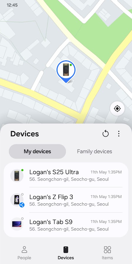 Samsung Find позволяет вам делиться своим местоположением с близкими, например с семьей и друзьями, и видеть, где находятся ваши подключенные родственники и друзья в режиме реального времени.