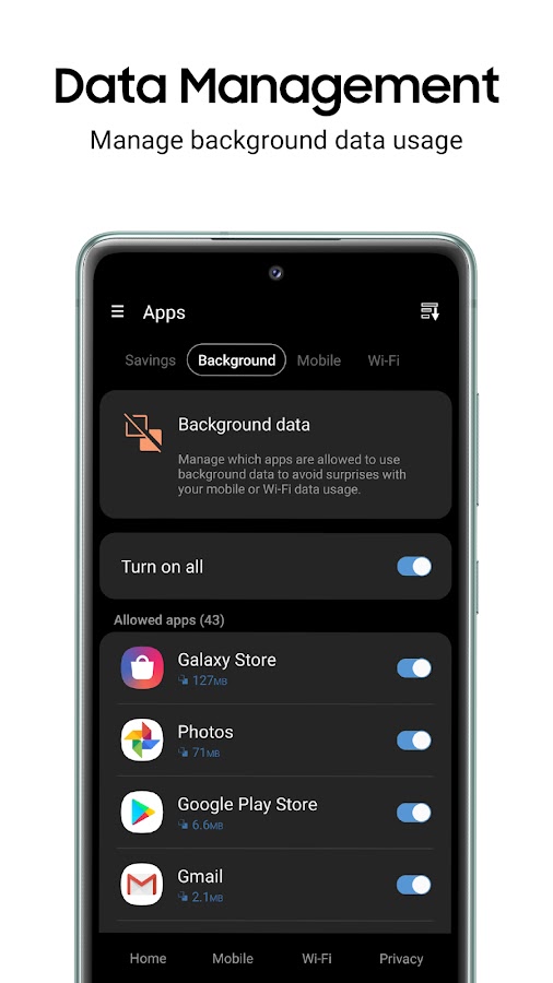 • УПРАВЛЯТЬ ПРИЛОЖЕНИЯМИ , ограничивая или ограничивая потребление мобильных данных и данных Wi-Fi, чтобы сэкономить деньги. Это просто, Samsung Max будет предупреждать о приложениях, использующих слишком много фоновых данных.