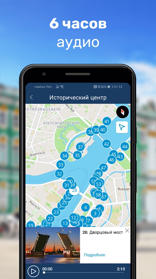 — Готовый план изучения города на несколько дней, содержащий более 6 часов увлекательных аудио историй о Санкт-Петербурге