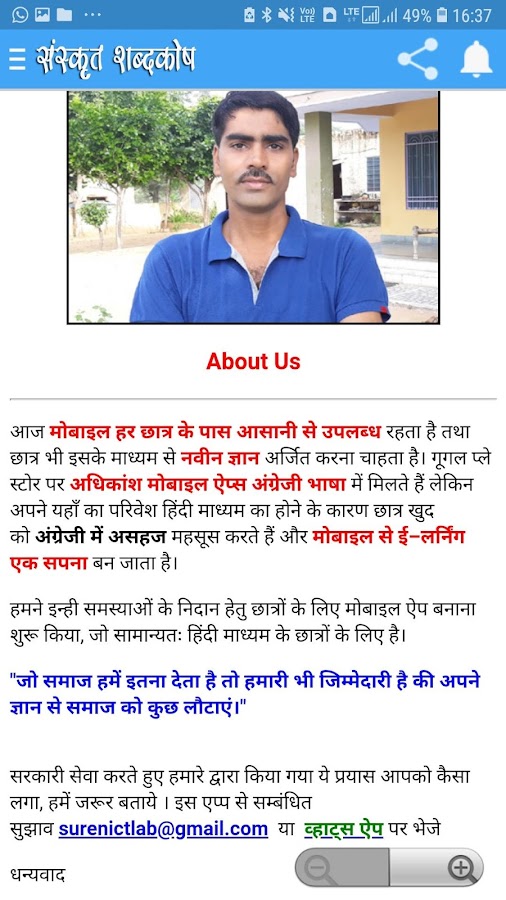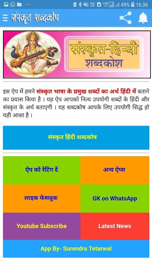 В этом приложении мы постарались передать значение основных слов санскритского языка на хинди и на английском языке. Это приложение подскажет вам значения ежедневных полезных слов на хинди и санскрите. Надеюсь, этот словарь окажется для вас полезным.