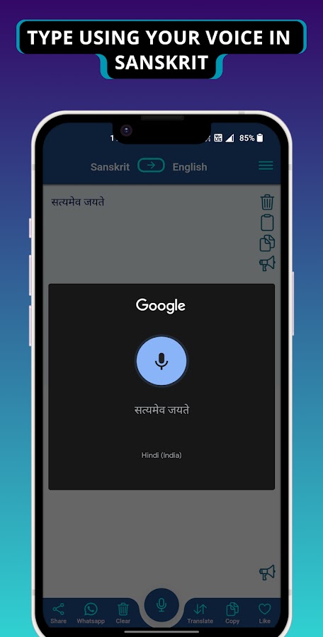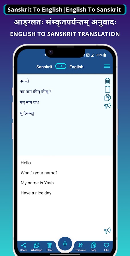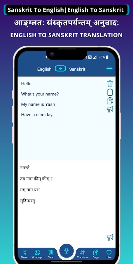 Приложение-переводчик санскрита на английский — бесплатный переводчик, который переводит санскрит на английский или с английского на санскрит. Приложение Sanskrit — English поможет вам общаться на санскрите и английском языке с помощью простых и быстрых переводов. Он переводит как слова, так и полные предложения. Лучшее приложение для простых и быстрых переводов. В этом приложении есть функция преобразования текста в текст, с помощью которой вы можете печатать, просто говоря своим голосом, и вы получите перевод.