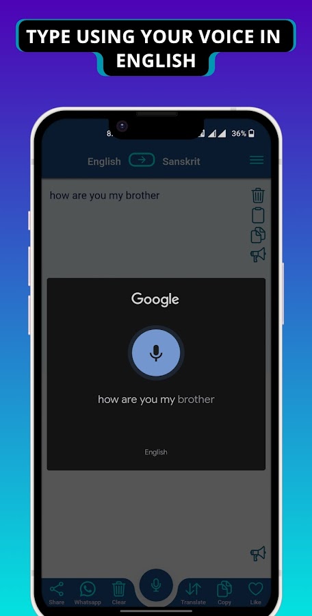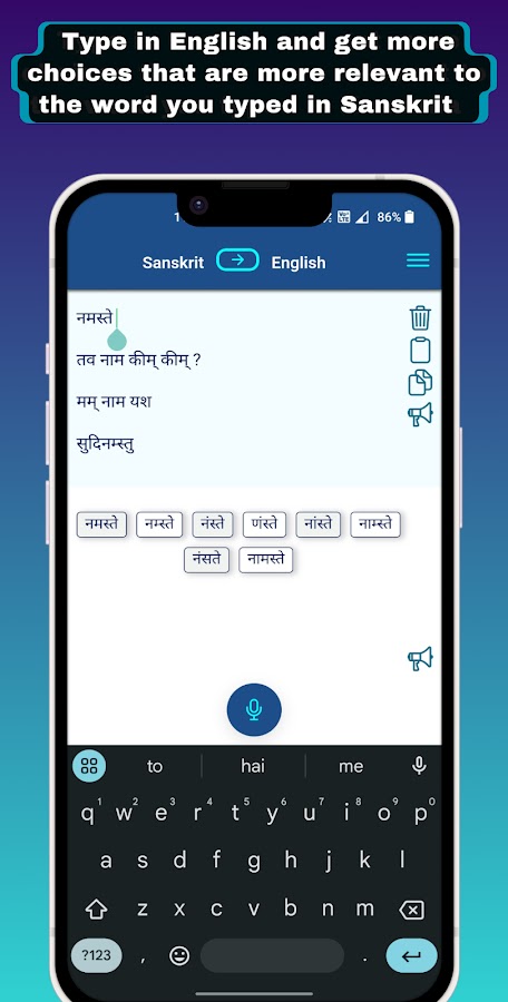 Используя кнопку переключения вверху, вы также можете вводить текст на английском языке. Это делает набор текста на английском языке естественным. Когда вы вводите санскритский символ, он автоматически переводится на английский алфавит. Когда вы нажмете пробел, в нижней части экрана появится больше слов, содержащих дополнительные варианты, соответствующие только что набранному вами слову. Вы можете печатать на английском языке, используя санскритские буквы, так, как вы на них говорите. Как только вы закончите печатать на английском языке, вы можете использовать кнопку перевода внизу, чтобы перевести английские тексты на санскрит.